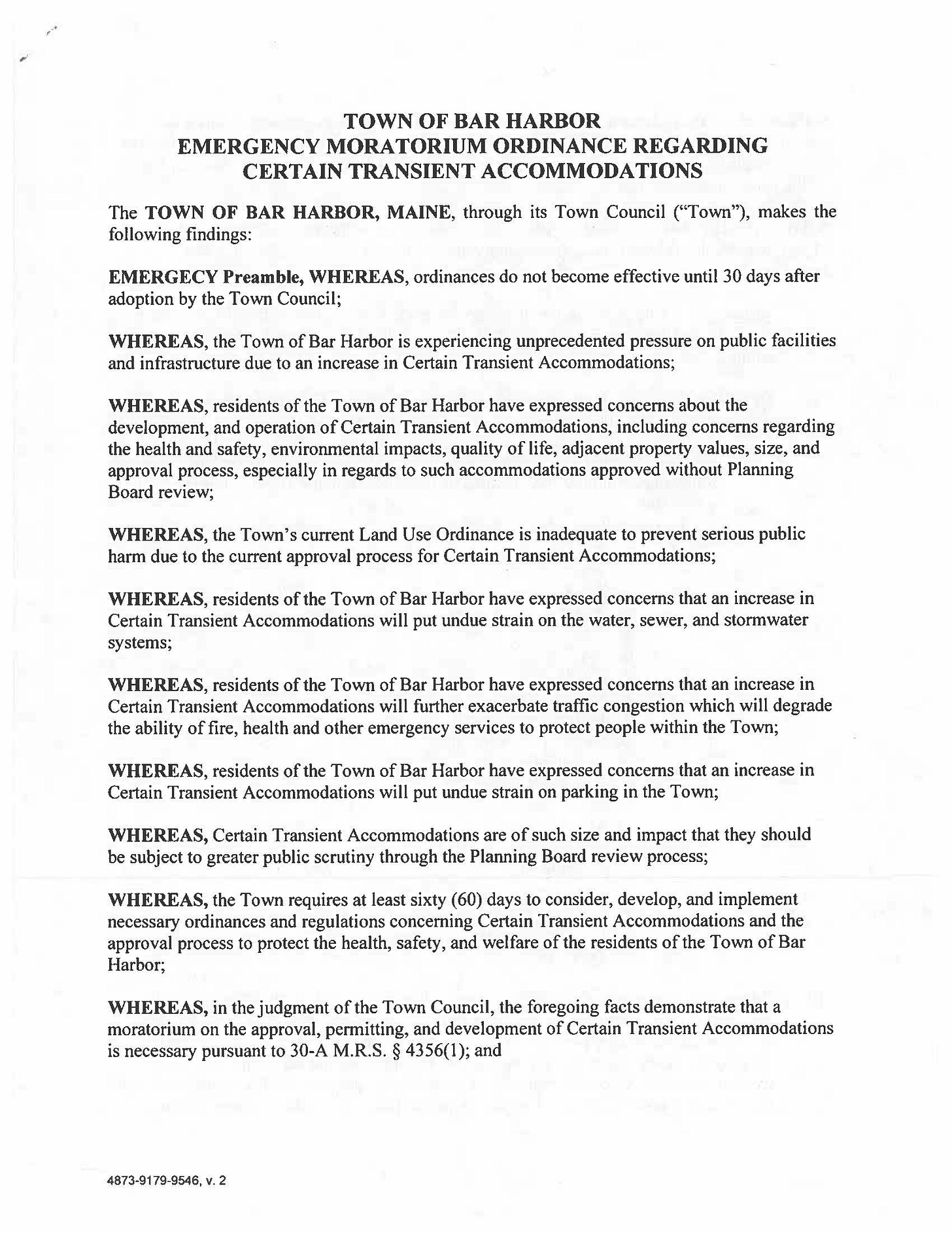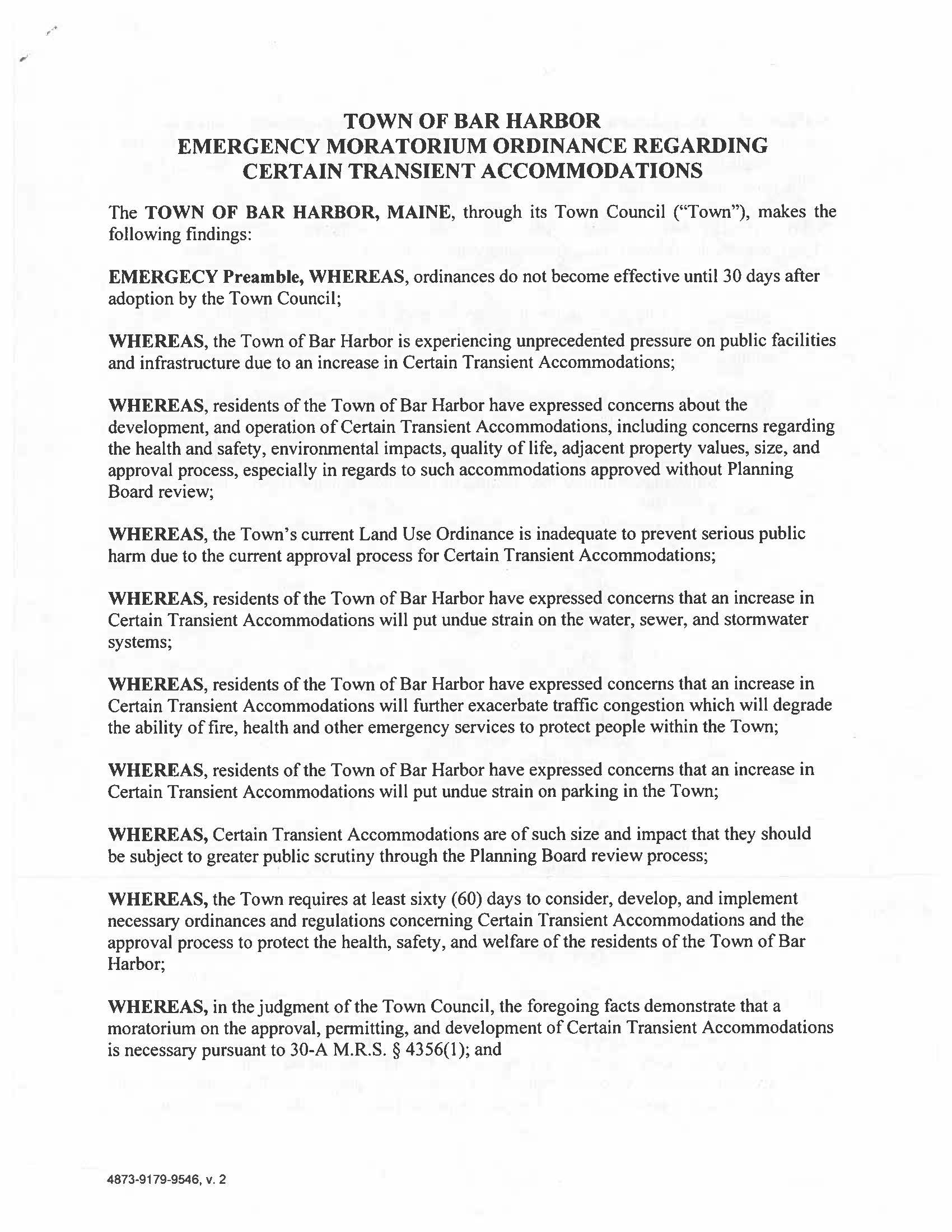 “WHEREAS, the Town of Bar Harbor is experiencing unprecedented pressure on public facilities and infrastructure due to an increase in Certain Transient Accommodations;