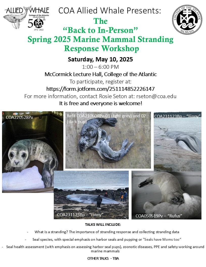 COA Allied Whale will hold its annual Spring Stranding Response Workshop on May 10 from 1:00-6:00 p.m. in the McCormick Lecture Hall on the campus of the College of the Atlantic.