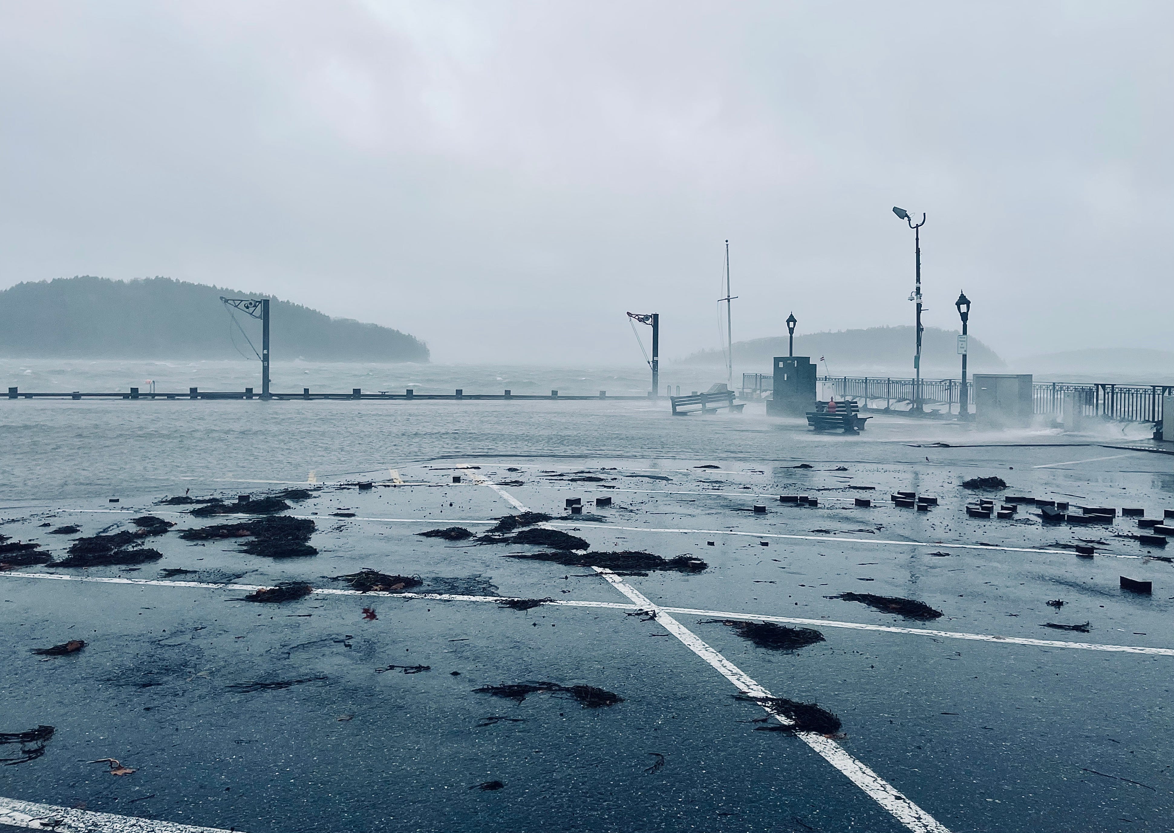 That December 2022 storm swept away one of the Oceanarium’s observation decks. Workers waited until another high tide, tied the platform to a kayak, and pulled it across the water, putting it back in place. That storm coincided with another king tide.