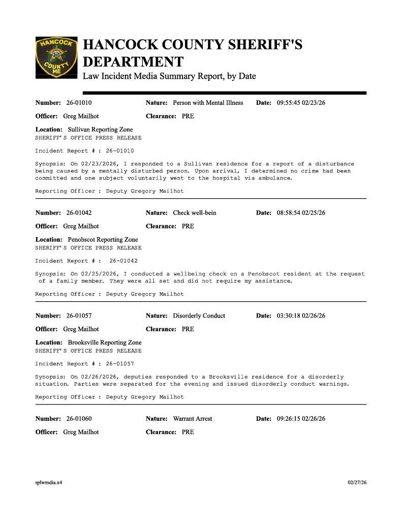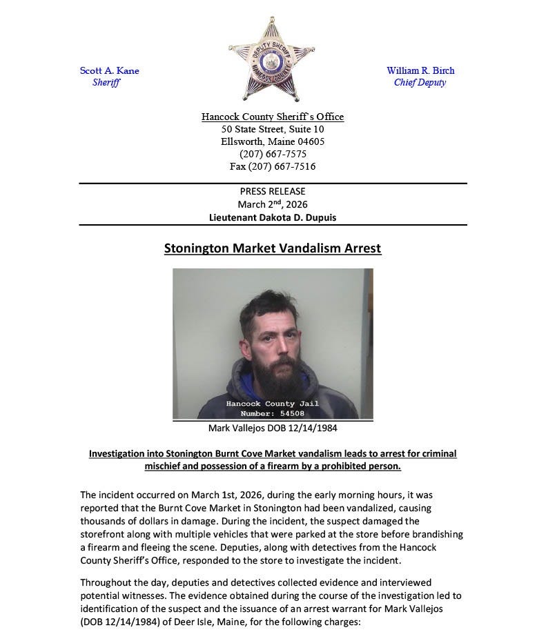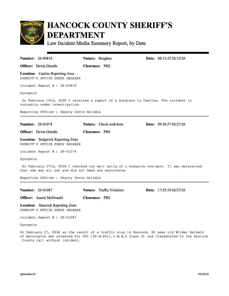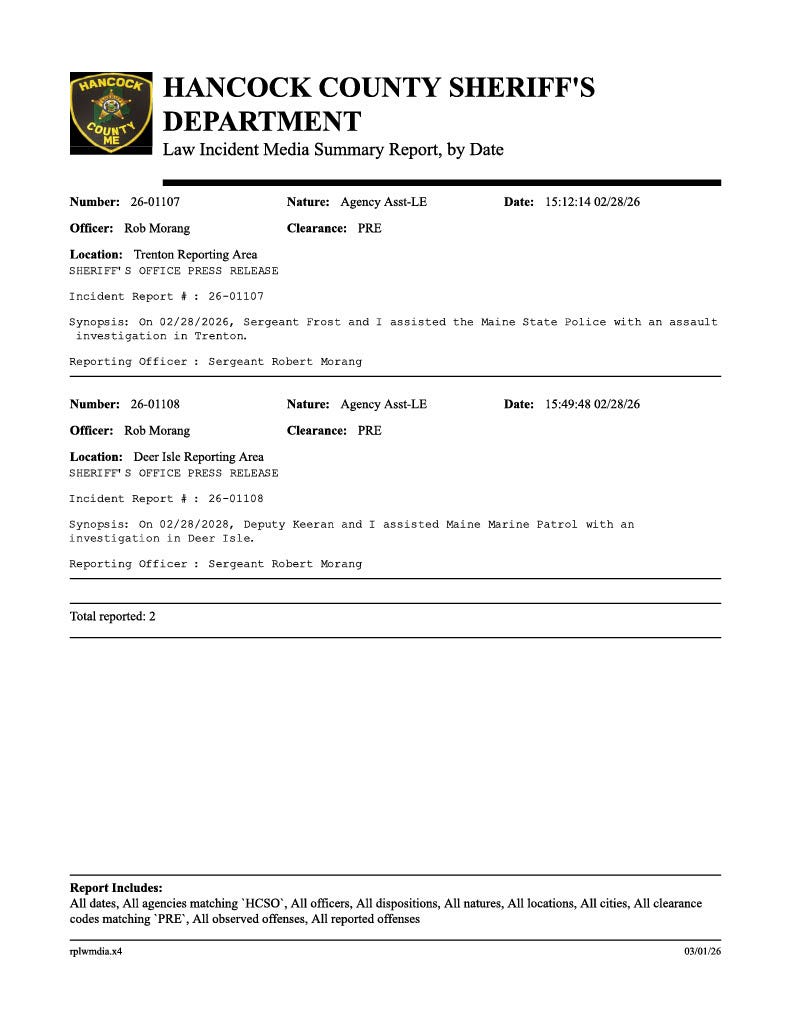 These are the Maine State Police press releases from the last few days. The Bar Harbor Story will include these each week though most (and sometimes all) do not occur on Mount Desert Island.