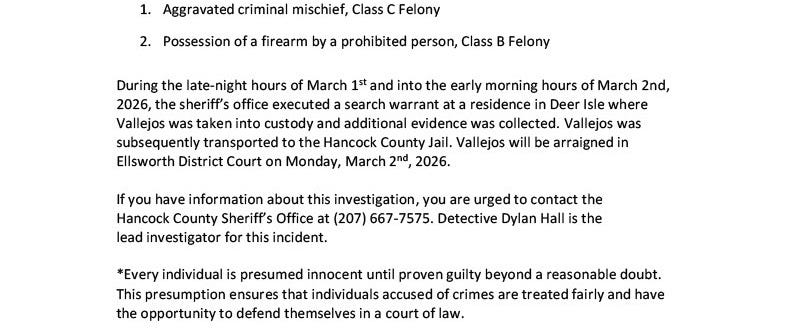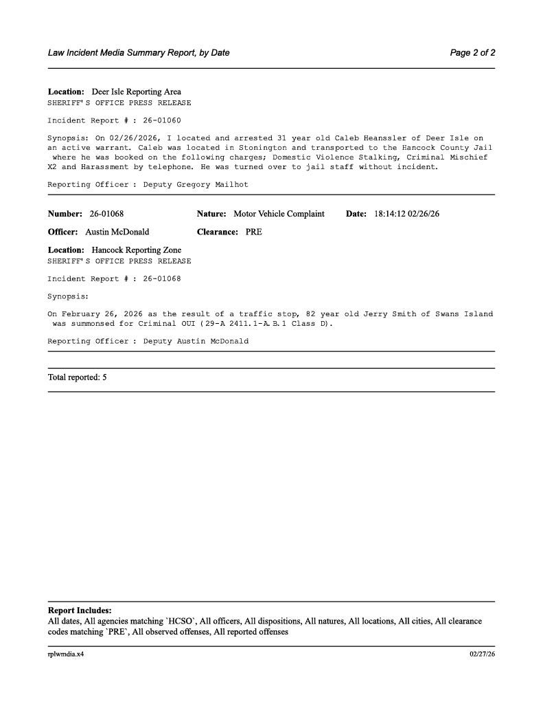 Police updates for Bar Harbor, Mount Desert, Southwest Harbor, Tremont, State Police and Hancock County Sheriff's Department.