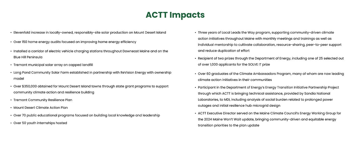 MOUNT DESERT—Ten years ago, A Climate to Thrive (ACTT) began with gatherings. People would come together at potlucks, sharing food, sharing ideas, creating energy to work toward goals meant to create better futures for Mount Desert Island.