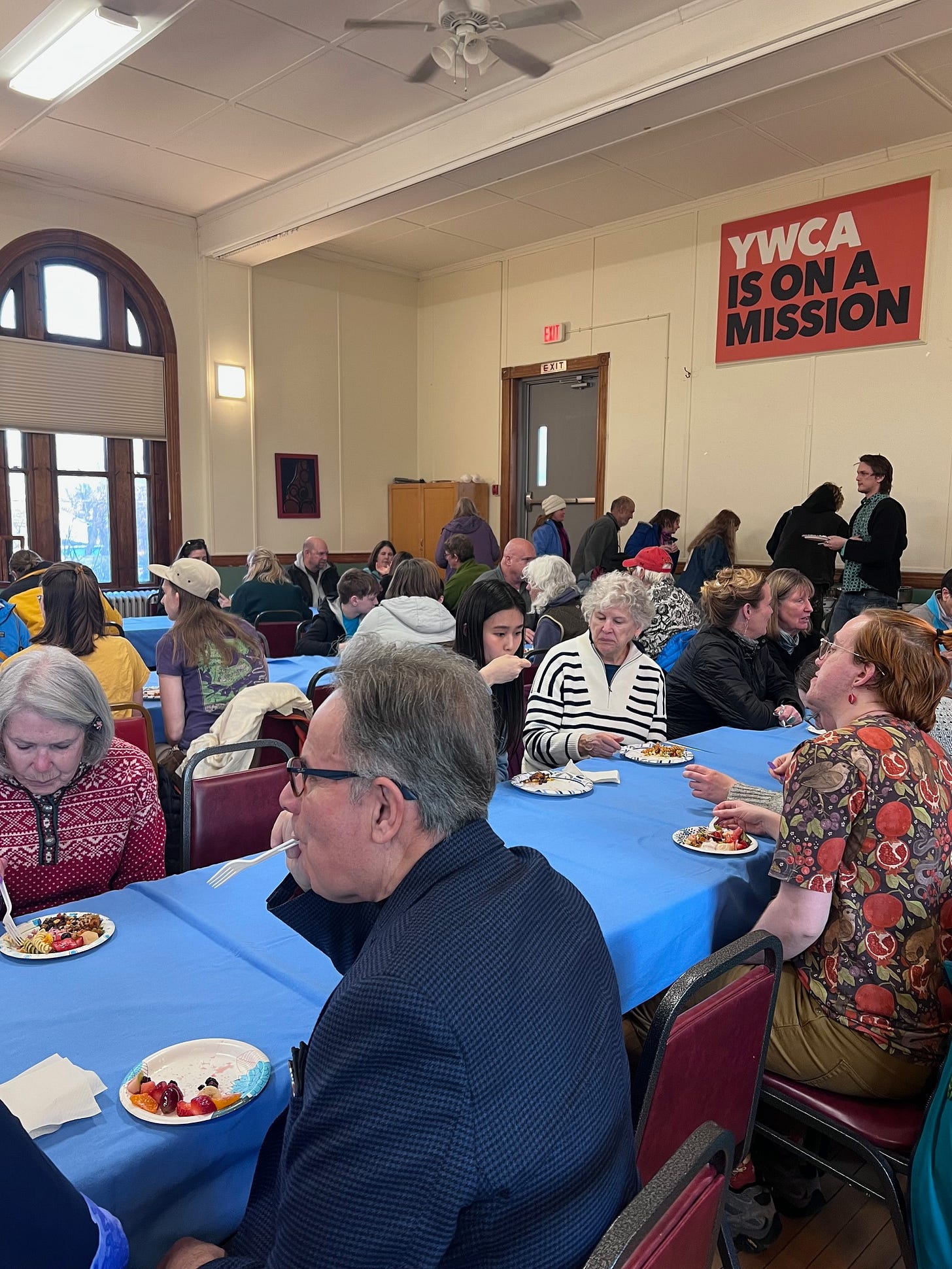 Next on the itinerary was the YWCA, where a variety of salads awaited us. The old gym was packed, with only a few seats left, a testament to the event's popularity. The sense of community was palpable as people shared stories and enjoyed the delicious offerings.